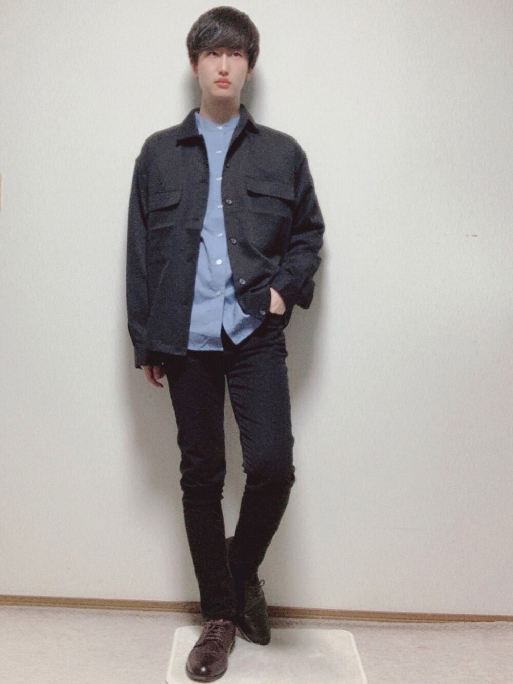 シャツジャケット×スキニーのセットアップ風コーデです🎶 ポイントは、インナーの水色シャツです! スタイリッシュにまとめながらも、カラフルな感じが出てよりオシャレにみえます👏 個人的には、このジャケット使用のベストコーデ👍