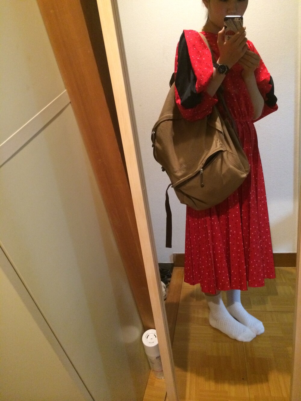 ワンピース:ブランド不明 リュック:無印良品 靴下:tutuanna 腕時計:CABANE de zucca