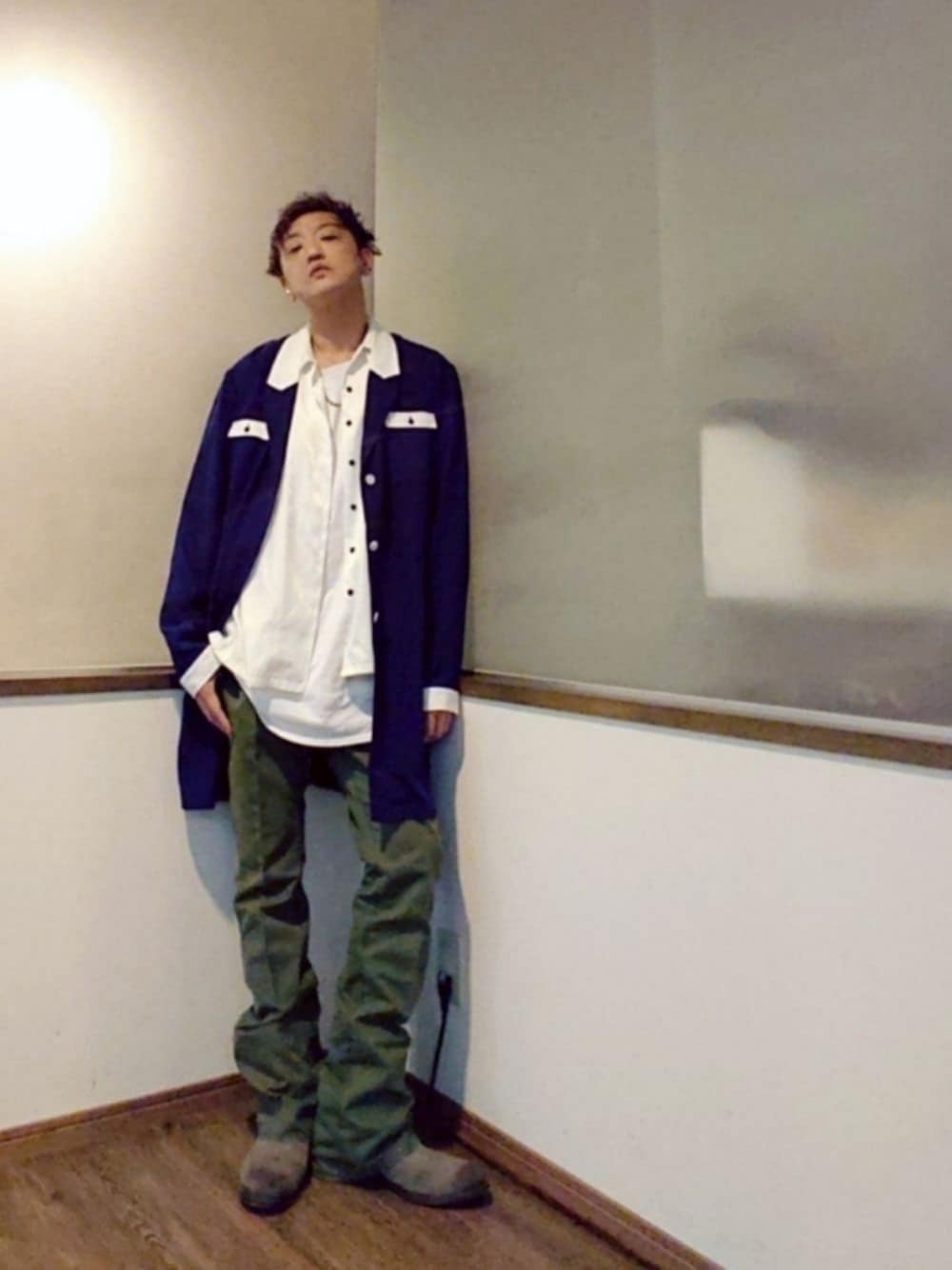 ご覧頂きありがとうございます いいね フォルダイン フォロー心より感謝申し上げます✨ 本日も2度の投稿御容赦ください💦 白のビッグシルエットT シルバーのロザリオ 白でサテンのオープンカラー 青×白のビッグシルエットでロングなボウリングシャツ スモーキーグリーンのフレアパンツとブーツ ゆるりとだらりと脱力で ちょっと寝起きのロックスタイルw やさぐれ感を大切に……(笑)