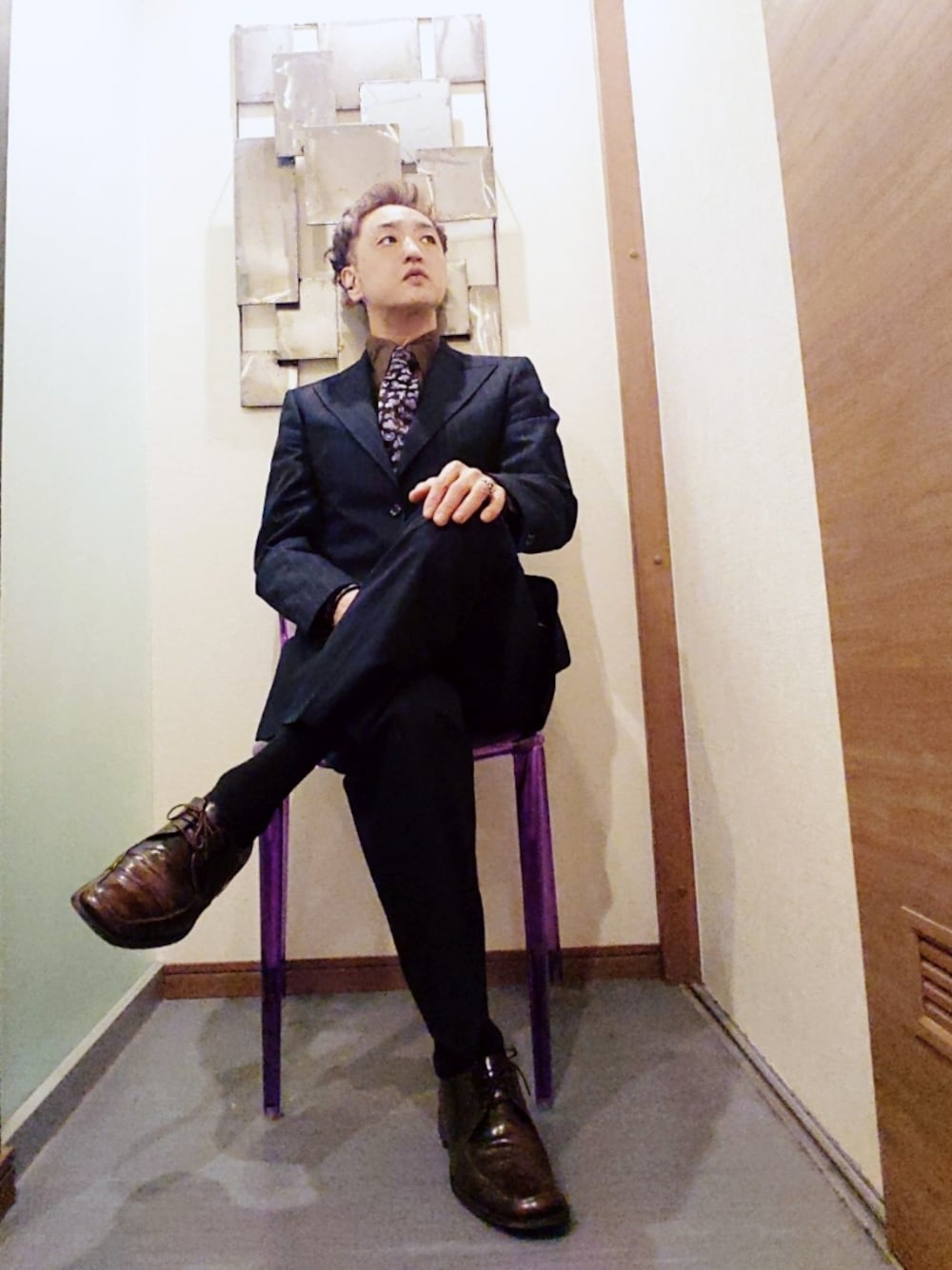 ご覧頂きありがとうございます 沢山のいいね 素敵なフォルダ 貴重なフォロー 心より感謝申し上げます✨ たまにはスーツ ちょっと変形なスーツ(分かりにくいですが) ネイビーにピークドラベル 少しひろめなのも特徴 シャツもそれにあわせてやや広めな襟のものを ブラウン×ピンクのペイズリーのネクタイはセミウィンザーノットで 足元は艶かんのあるブラウンで 夜の人みたい……(笑) でもとりあえずスタイル良く見える それだけだな(笑)