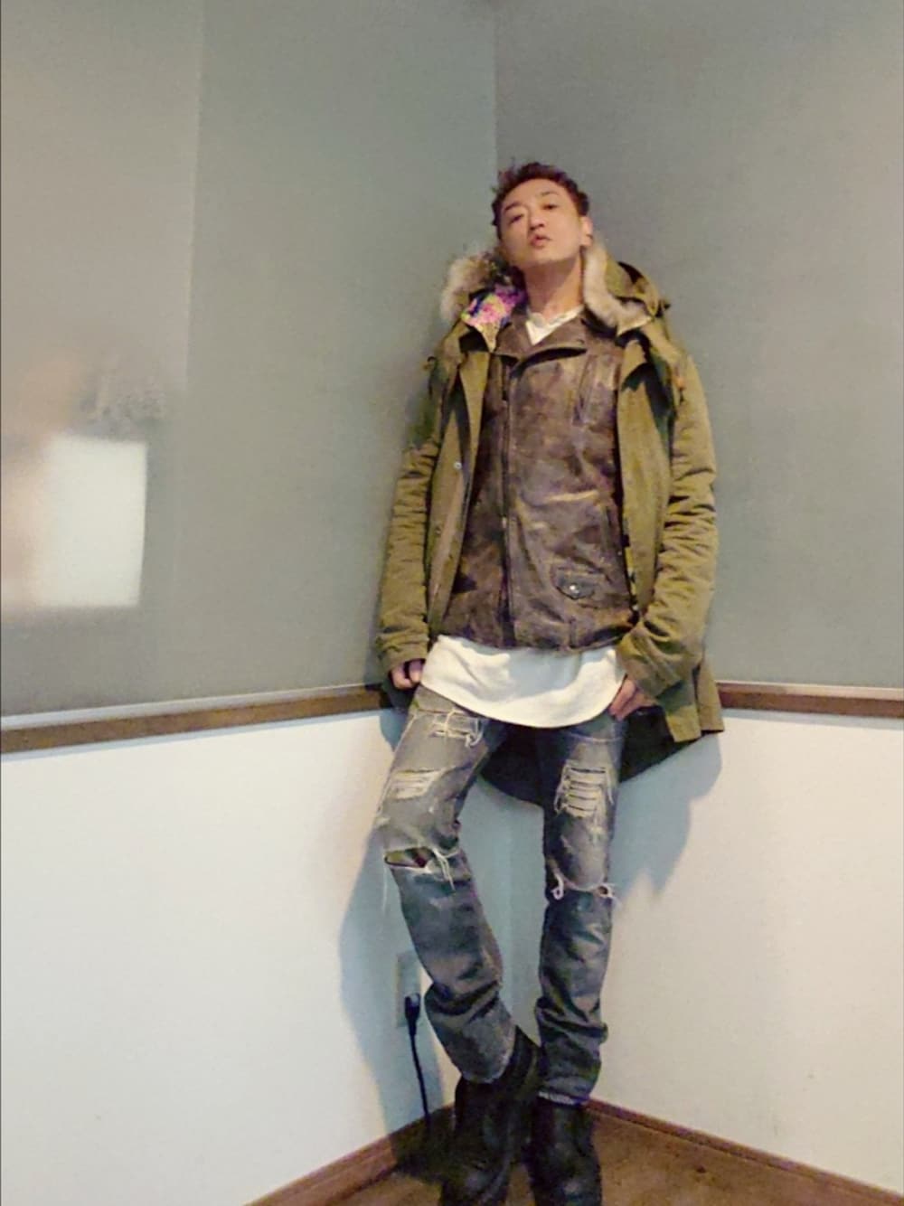 ご覧頂きありがとうございます 沢山のいいね ステキなフォルダ 貴重なフォロー コメント 心より感謝申し上げます✨ ライダースとモッズコートのレイヤードスタイル 華やかな裏地のモッズコートに ユーズド加工のライダース ダメージデニムに合わせて武骨な印象に