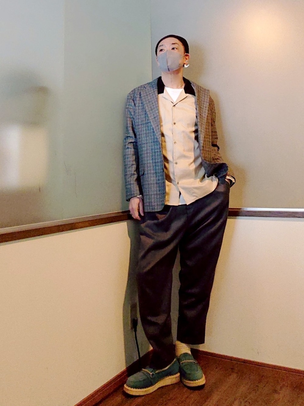 ご覧いただきありがとうございます。 沢山のリアクション心より感謝申し上げます✨ グレーのジャケット 着崩し サルエルかつオーバーサイズのパンツはややバルーンな感じが良い センタープレスと光沢で良い感じ ベージュのオープンカラーは襟と素材が好み シャツとソックス合わせつつ ラバーソールのね色で外しこっそりソールで又合わせる…… ニットのっけて終わり! いい感じにおっさん感(笑)