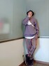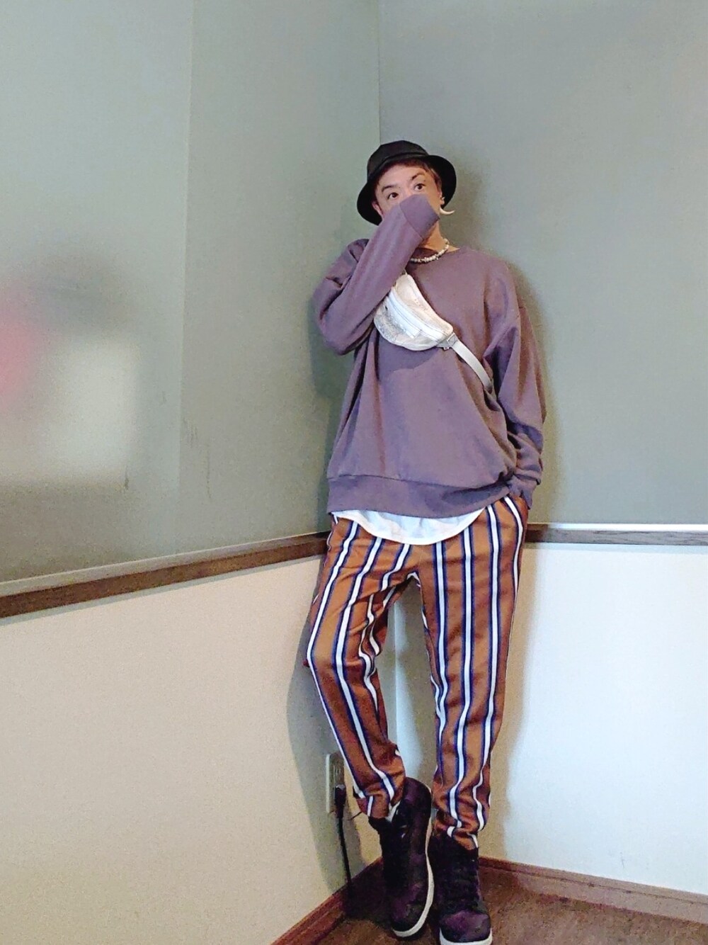 ご覧いただきありがとうございます。 沢山のリアクション心より感謝申し上げます✨ パープルのスウェットとゴールド×白×青×黒のストライプのジャージパンツのゆるコーデ。 白を効果的に♪ ちょっとお調子者な感じテンションあげてくれます(笑)