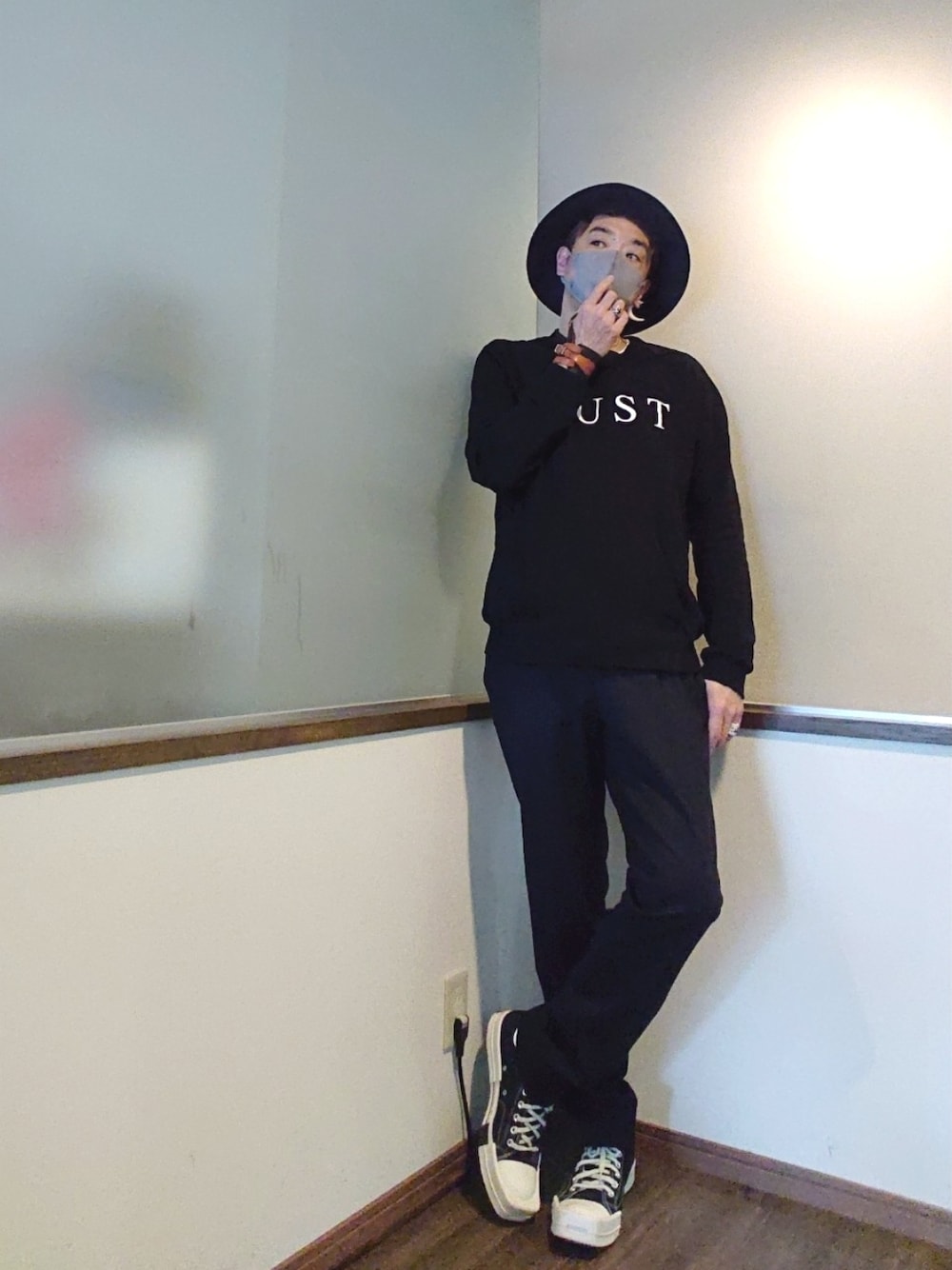 ご覧いただきありがとうございます。 沢山のリアクション心より感謝申し上げます✨ 黒のハット 黒のロゴスウェット 黒のスラックス 黒のハイカットスニーカー のシンプルコーデ。 ロゴのDUSTが胸に刺さります(笑) シンプルなスタイルはスラックスのシルエットが大切。このスラックスはノータックナチュラルテーパードで美脚効果あり。 敢えてレザーシューズは使わずスニーカーで。 独り言…… 頭の中で 朝から greed greed greed が流れっぱなし…… カラオケ行きたくなるなぁ でも もう声が出る気がしないw ※アクセはプロボーラーちゃうから(笑)