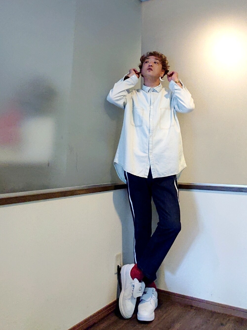 ご覧いただきありがとうございます。 沢山のリアクション心より感謝申し上げます✨ ライトブルーのビッグシルエットデニムシャツ サイドラインのデニム 足元 アクセサリーを白でまとめて ソックスの赤を効かせたコーデ。 天パがすげぇーw