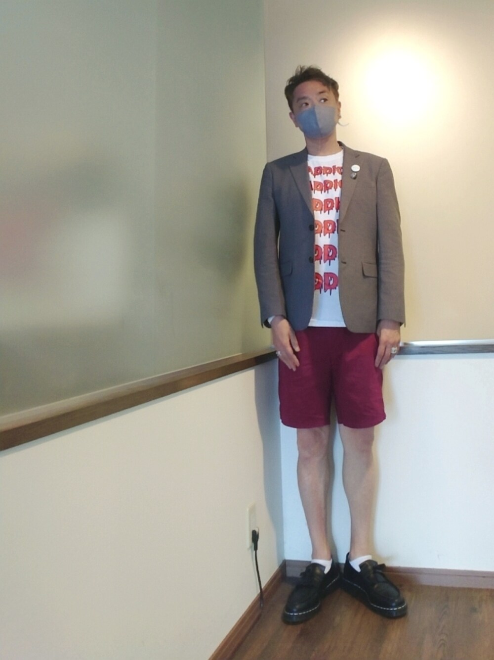 ご覧いただきありがとうございます。 沢山のリアクション心より感謝申し上げます✨ テーラードジャケット ロゴT カラーハーフパンツ タッセルローファー の大人コーデ。 ロゴの赤とパンツの赤をアクセントに