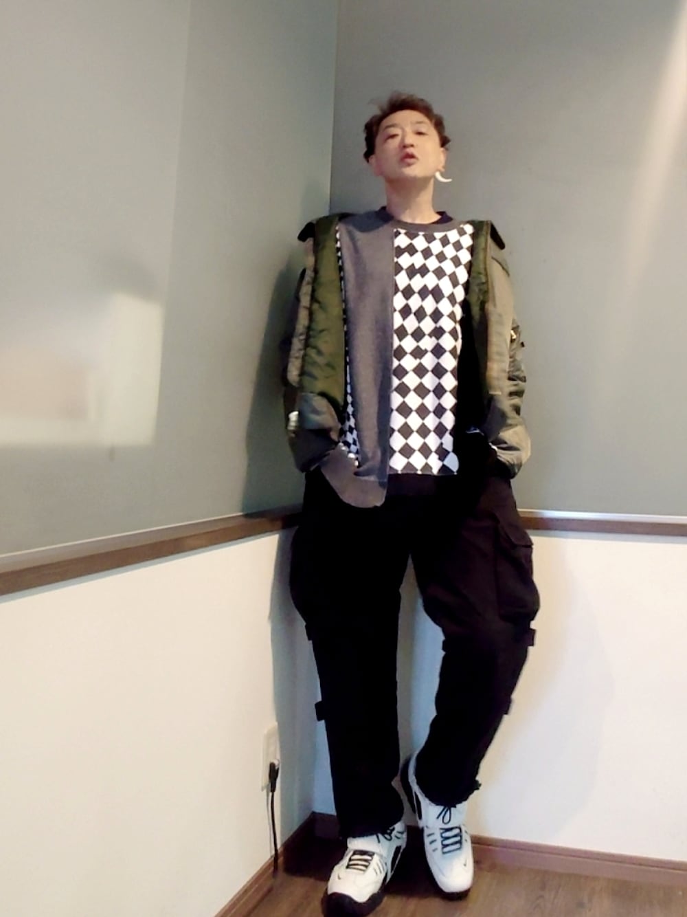 ご覧いただきありがとうございます。 沢山のリアクション心より感謝申し上げます。 ビッグシルエットでチェックかつクレイジーパターンのスウェットとカーゴパンツとスニーカーに フライトジャケットを羽織ったストリートスタイル。 リラックススタイルなのでカーゴパンツはフル解放で一番でかいシルエット。 白の効き具合がお気に入りです。