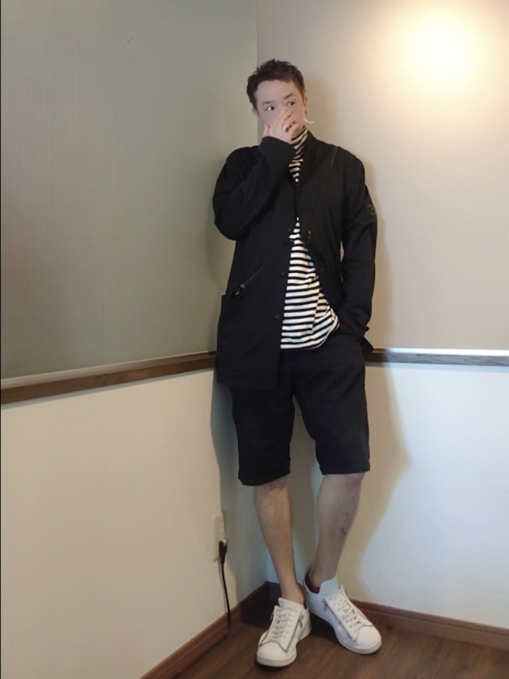 ご覧いただきありがとうございます。 沢山のリアクション心より感謝申し上げます。 ボーダーのモックネックロンT カーディガン ハーフパンツ 白スニーカー シンプルなモードスポーツミックス。