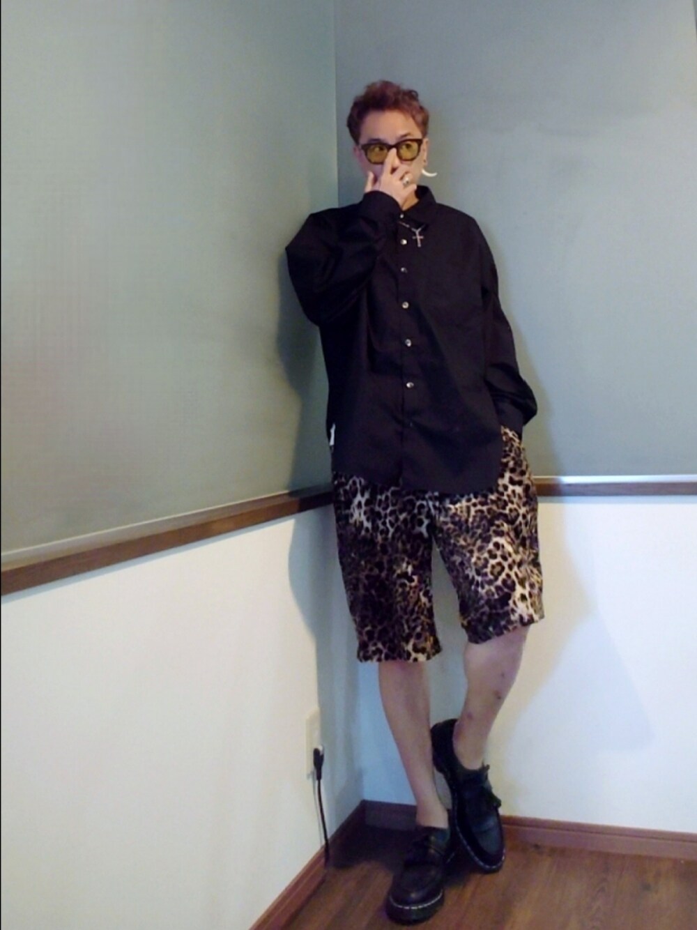 ご覧いただきありがとうございます。 沢山のリアクション心より感謝申し上げます。 ビッグシルエットの黒シャツとレオパードハーフパンツのシンプルコーデ。 マンガみたいなアイウェアと タッセルローファーが良い感じ。