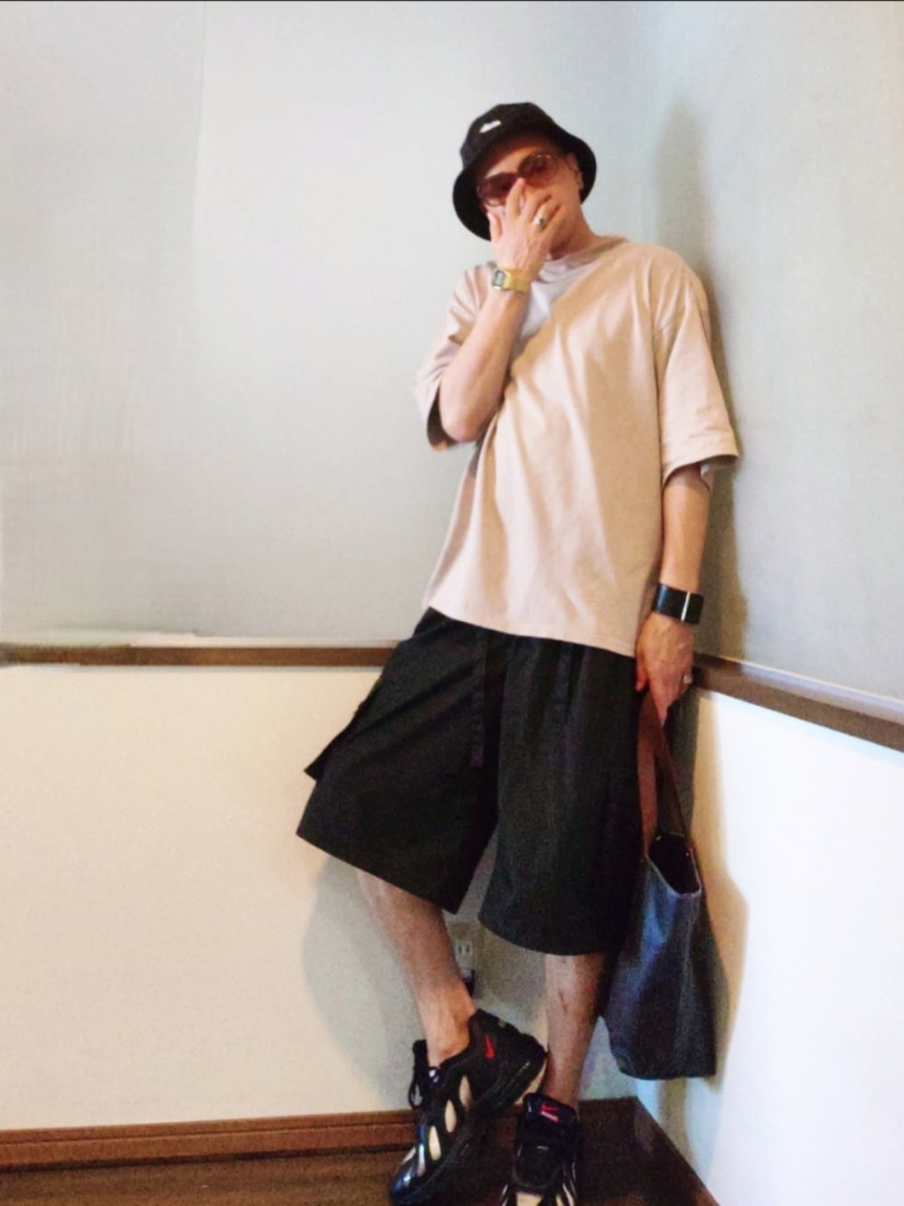 ご覧いただきありがとうございます。 沢山のリアクション心より感謝申し上げます。 バケハ×ビッグシルエットモックネック×ワイドカーゴハーフパンツ×airmax モノトーンで仕上げてちょっとモードな大人ストリート。 小物も良い感じ◎