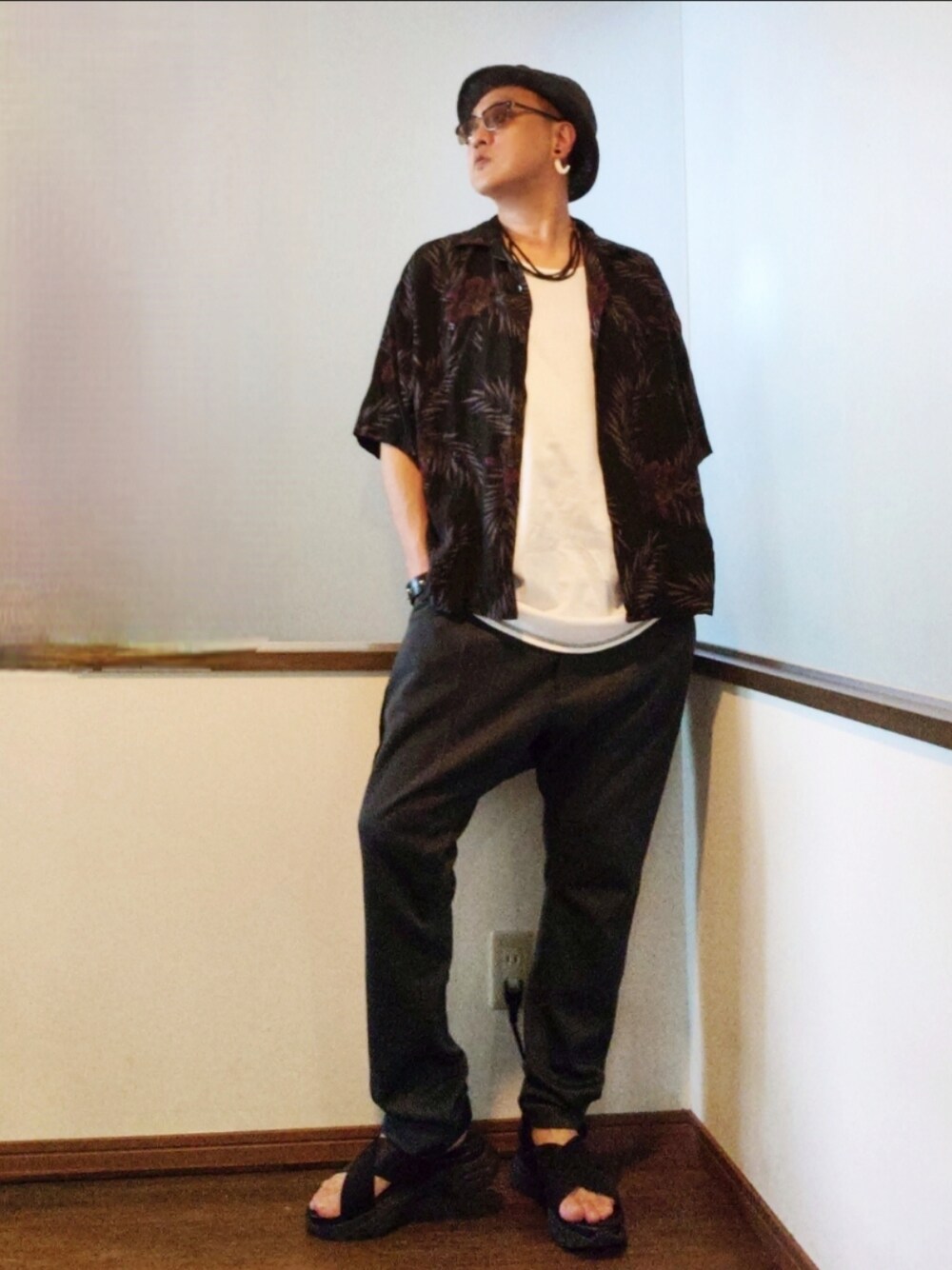 ご覧いただきありがとうございます。 沢山のリアクション心より感謝申し上げます。 シンプルな柄シャツ×トラックパンツ×スポーツサンダルコーデ。 サルエルなトラックパンツが又良い◎