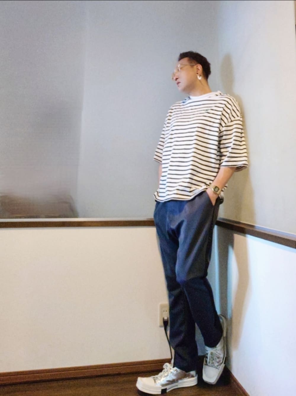 ご覧いただきありがとうございます。 沢山のリアクション心より感謝申し上げます。 ボーダーモックネックTと サルエルトラックパンツのキンプルなスポーツミックス。