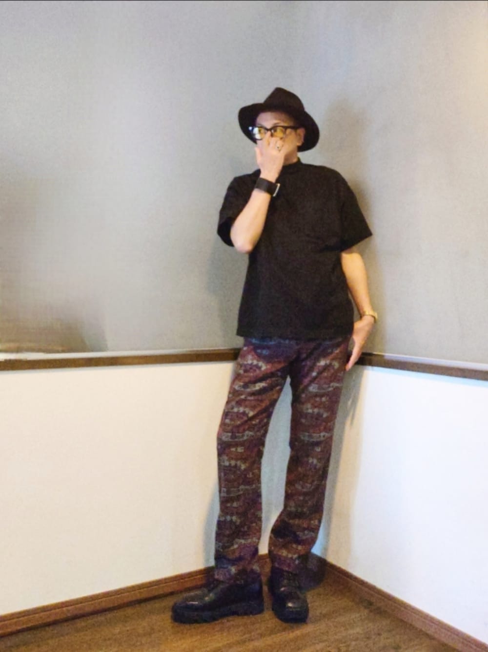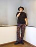 ご覧いただきありがとうございます。 沢山のリアクション心より感謝申し上げます。 モックネック✕柄パンツ 黒のモックネックはかなり厚手なので半袖ながら丁度よい季節。 ストライプのパンツにプリントを施されたパンツはシルエットも今年らしくて(古いモノですが)何か気分です。