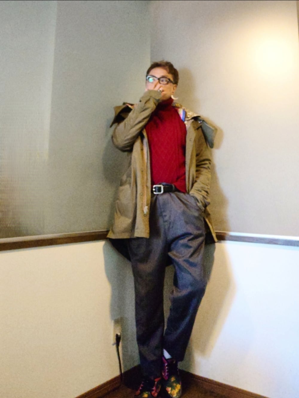 ご覧いただきありがとうございます。 沢山のリアクション心より感謝申し上げます。 モッズコート✕赤タートルネックニット✕スラックス✕スニーカー