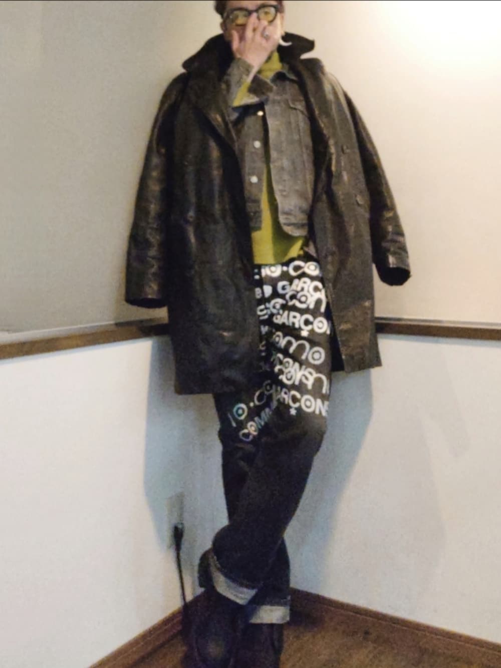 ご覧いただきありがとうございます。 沢山のリアクション心より感謝申し上げます。 カウレザーのPコート✕デニムジャケット✕モックネックニット✕ペイントデニム✕ブーツ 冬のデニムコーデ。 年代物のagnès b.のコートは古着で購入して長年愛用しているモノ とにかく重い(笑) インナーの差し色が抜け感◎