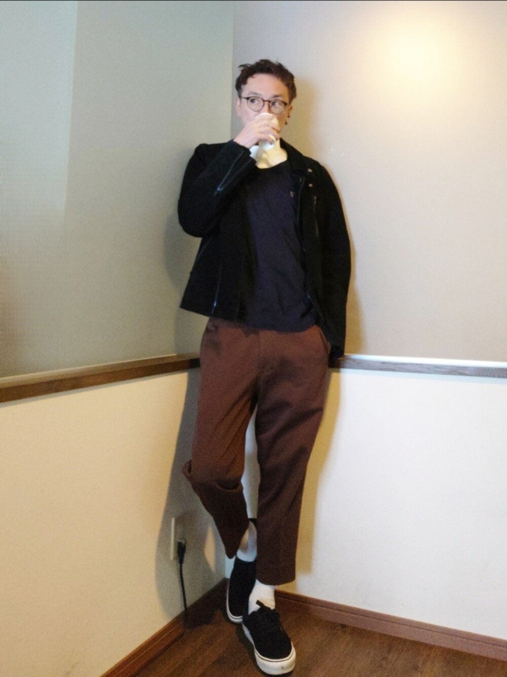 ご覧いただきありがとうございます。 沢山のリアクション心より感謝申し上げます。 白シャツ×Vネックニット×変形DickiesをスエードのライダースとスエードのVANSでまとめたコーデ。 やさぐれ過ぎず真面目過ぎない感じが◎ コーヒーは近所のセブンイレブン(笑)