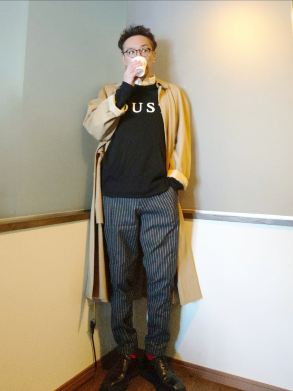 ご覧いただきありがとうございます。 沢山のリアクション心より感謝申し上げます。 シングルトレンチ×ロゴスウェット×白シャツ×ストライプパンツ 赤ソックスをチラ見せで黒のレザーシューズで〆 ※赤ソックスが良い仕事してます。 仕事柄トップス黒が多いのが悩めるところ 実は白の方がお客様のシルエット フォルム ニュアンスお見せする時に親切なのですが…… 一人だとこうなりがちです。