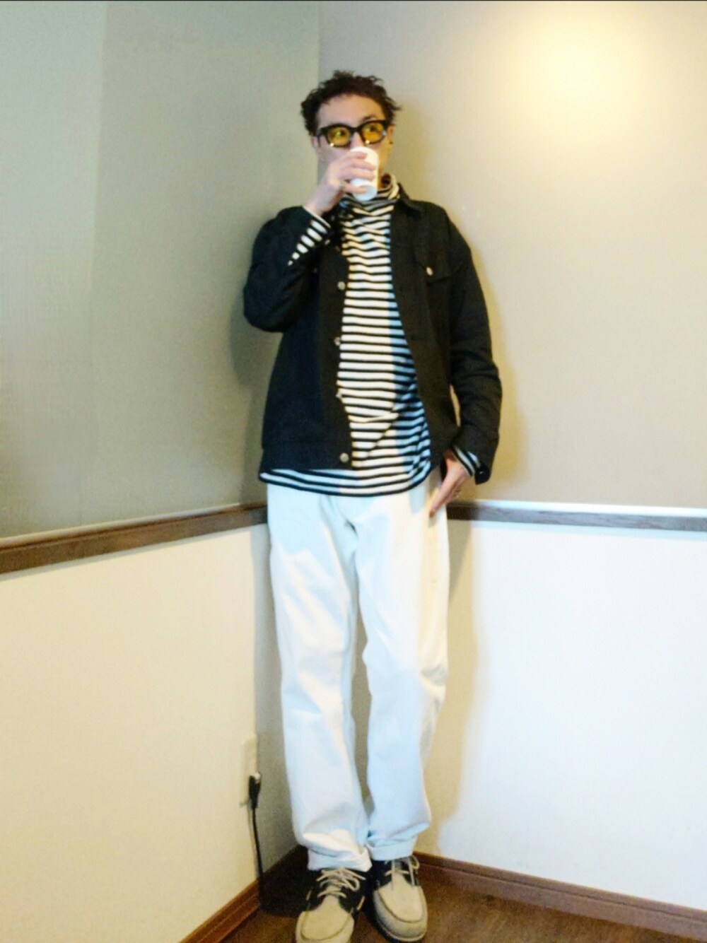 ご覧いただきありがとうございます。 沢山のリアクション心より感謝申し上げます。 シャツジャケット×ボーダーモックネックロンT オーバーサイズな白の502×モカシン カラーレンズをアクセントに。