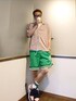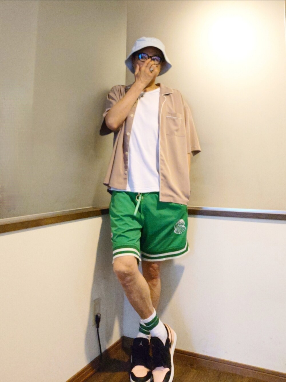 スポーツライクなハーフパンツとパジャマシャツでL・Aの寝起きのおじさんスタイル。 ゆるさとカラーのバランスが好き。