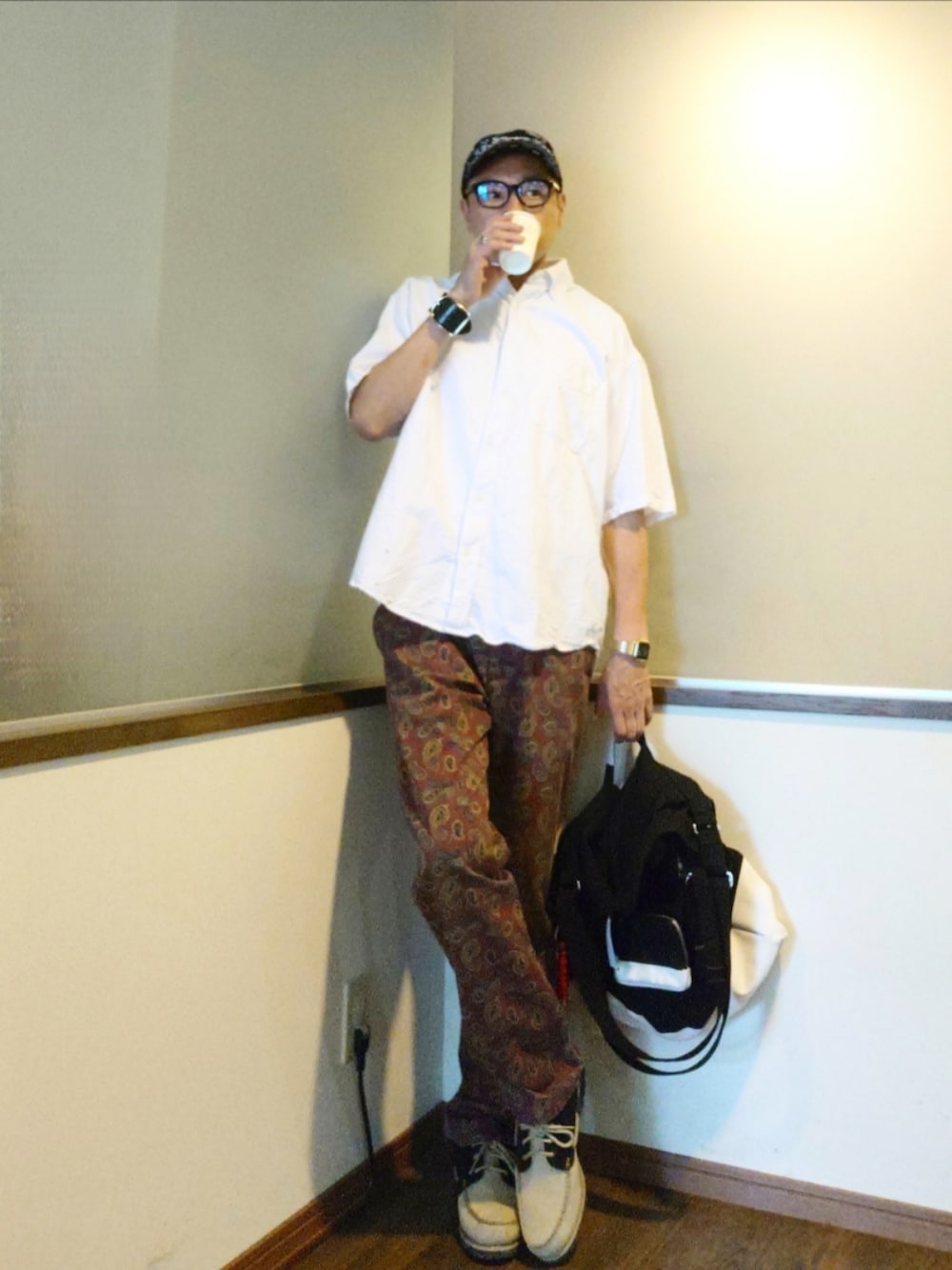 半袖の洗いざらしのBDとペイズリー柄の赤いワークパンツの大人カジュアル。