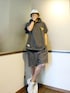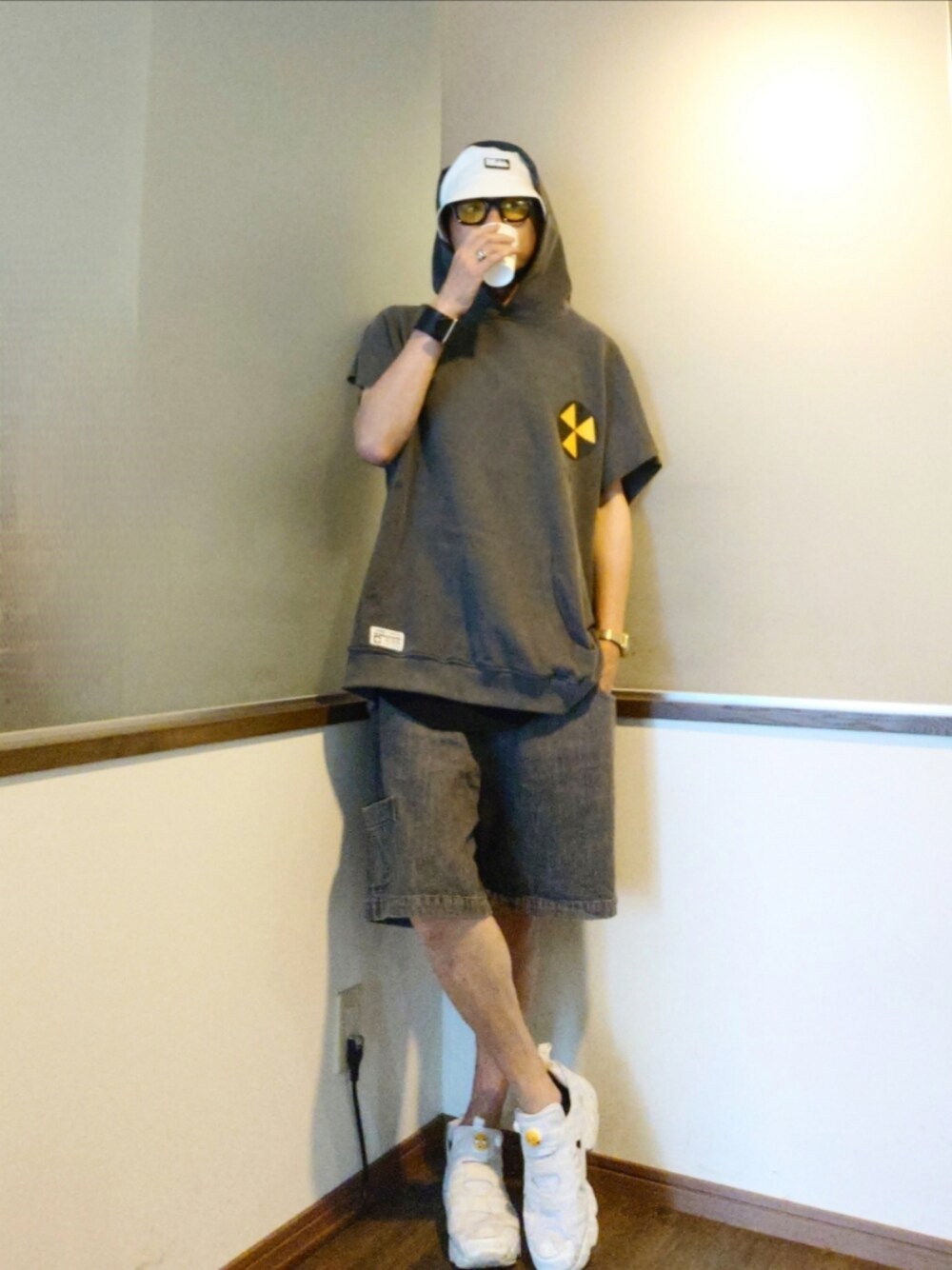 ビッグシルエットのカットオフフーディー×ブラックデニムのハーフパンツのシンプルな大人ストリートカジュアル。 白を効かせて こっそりとイエロー