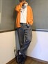 大人カジュアル。 リネン混のスラックスはレトロでノスタルジーな雰囲気でカーディガンとの相性が◎ 色味とロゴで遊びを加えて。