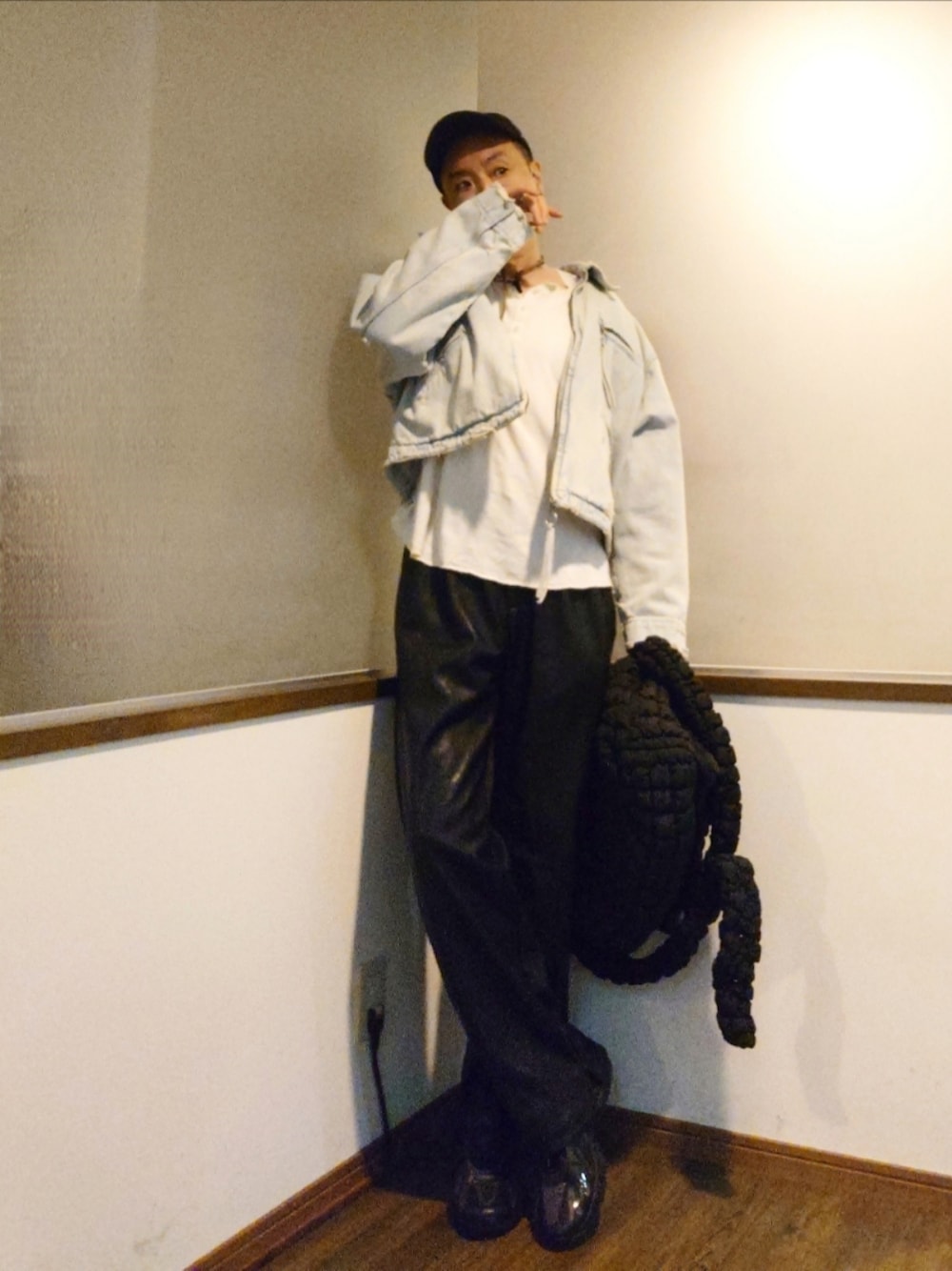 デニムジャケット×レザーパンツの秋スタイル。 シンプルが良い感じ。