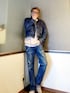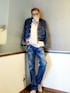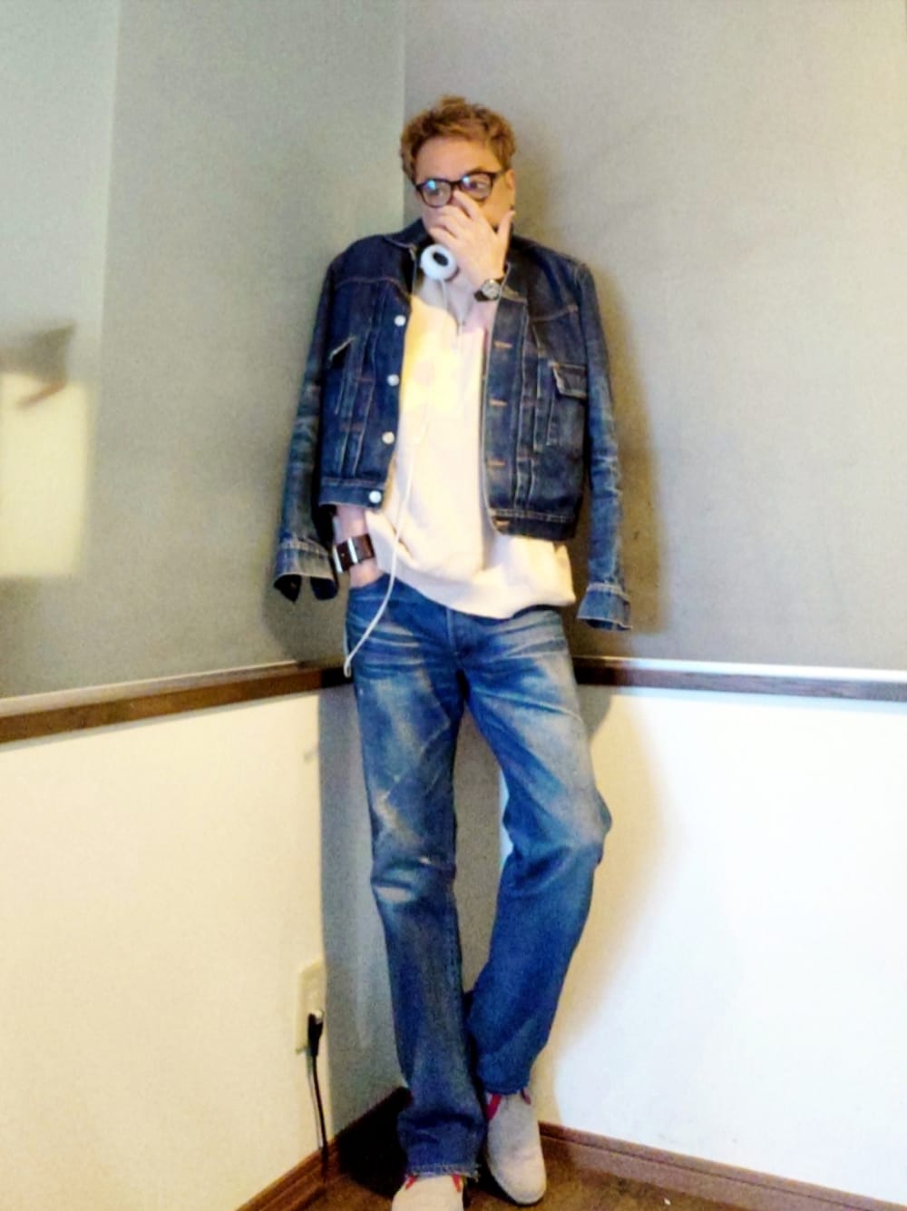 シンプルなデニムオンデニム ニットをポイントに。(見づらいですがw) 今回はスッキリとしたストレート(501)を合わせて。