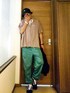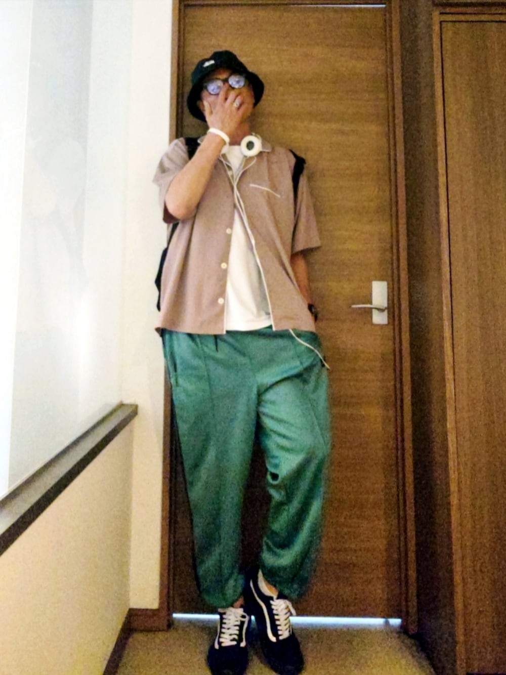 スケートな大人カジュアル。 ピンクのパジャマシャツ×グリーンのトラックパンツは黒で締めつつ白で仕上げ。