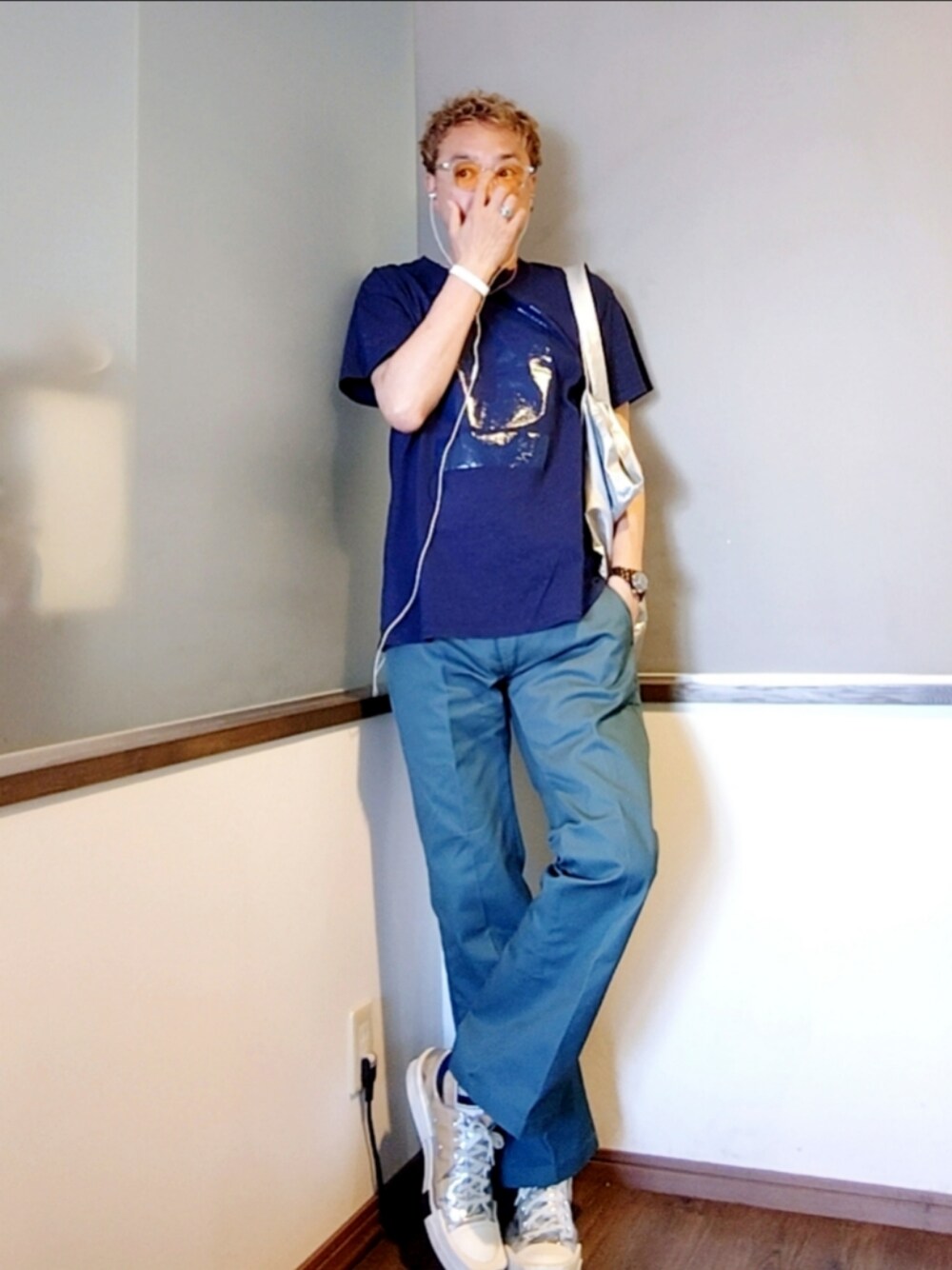 Tシャツ×Dickiesの大人カジュアル。 ミントカラーだとDickiesでも爽やか ブーツカットでレングスも少し短めなのが又良い感じ。 アイウェアとバッグシューズで程よいアクセント。 にしても… ラバープリントって暑いですよね(笑) 今日は暑いので “SUMMERNUDE” 勿論 山P…じゃないほうの 真心ブラザーズ✨ この声が好き♪