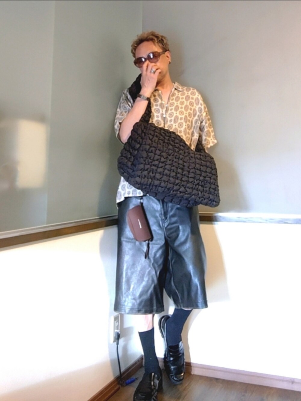 夕方外出な大人カジュアル。 柄シャツ×レザーハーフパンツ×ローファー サングラスケース悪目立ちw ケースはこの後外して外出しましたm(_ _)m