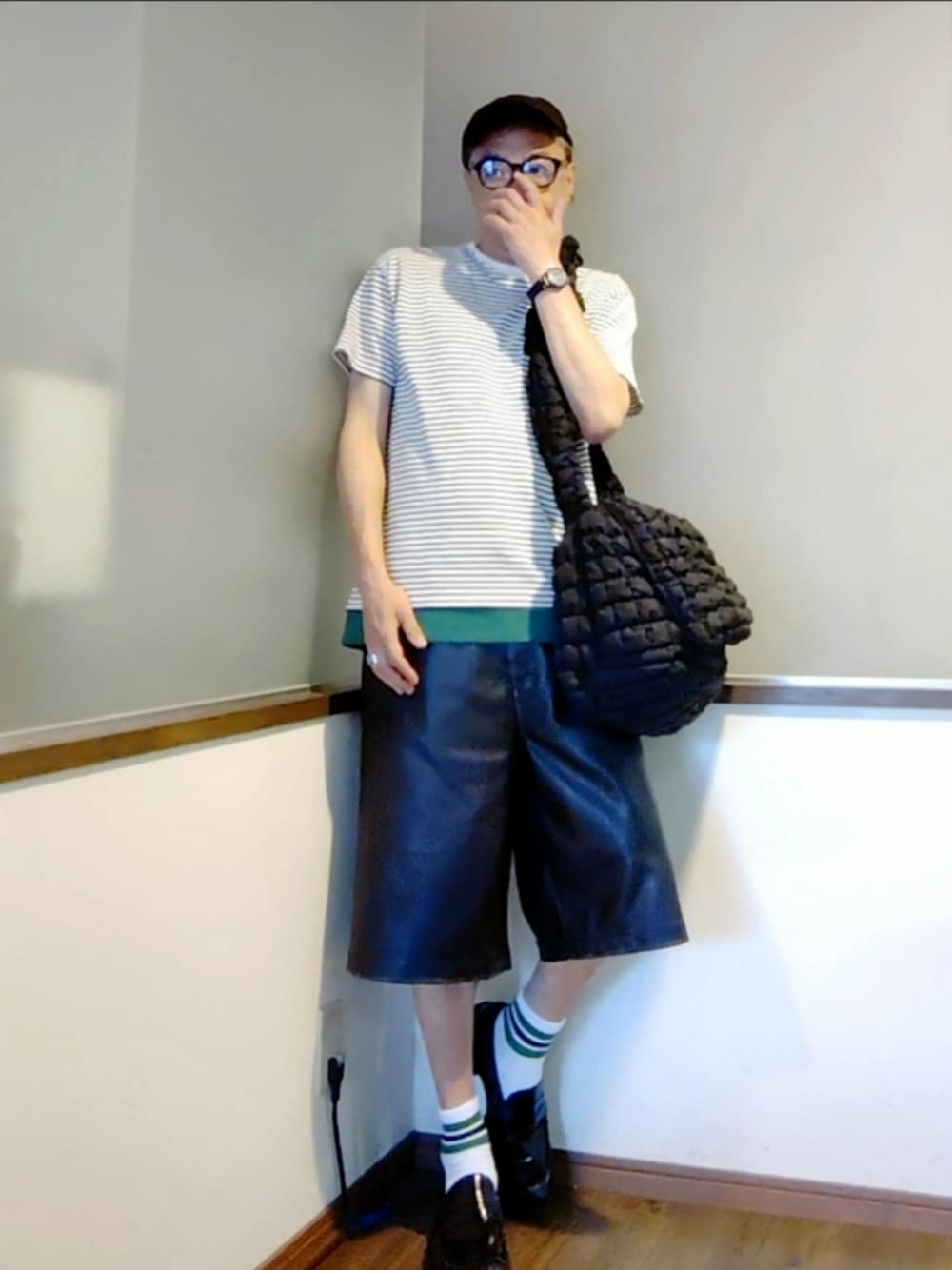 Tシャツ×ハーフパンツの大人カジュアル。 メッシュ(グリーン)の切り替えが目を引くボーダーTシャツとフェイクレザーのバギーハーフパンツのコーデ。ちょっと独特な雰囲気が◎ パンツ下げすぎたかな(笑) けどコレくらいが良い気もする☺