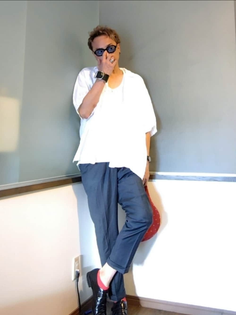 大人の夏カジュアル。 シアーな白シャツ×白タンクはさりげなく涼しげで◎ 足元はパンチングレザーの革靴。