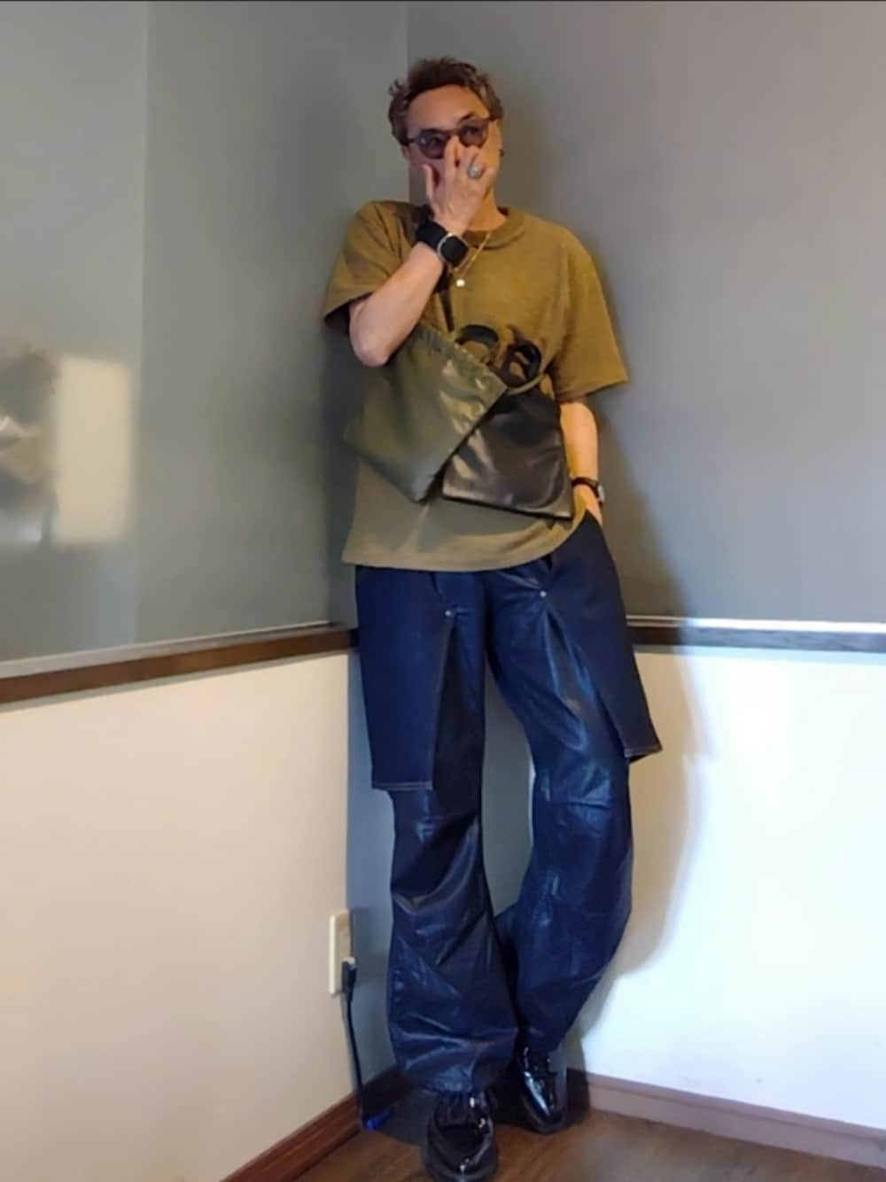 P3のショルダーバッグ「《UNISEX》【EX】Vegan Leather Shoulder Drawstring Bag/ヴィーガンレザー巾着ショルダーバッグ【MAISON SPECIAL/メゾンスペシャル】」を使ったコーディネート