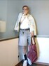 デニムオンデニム×白シャツの大人カジュアル。 レイヤードさせたバッグをアクセントに。