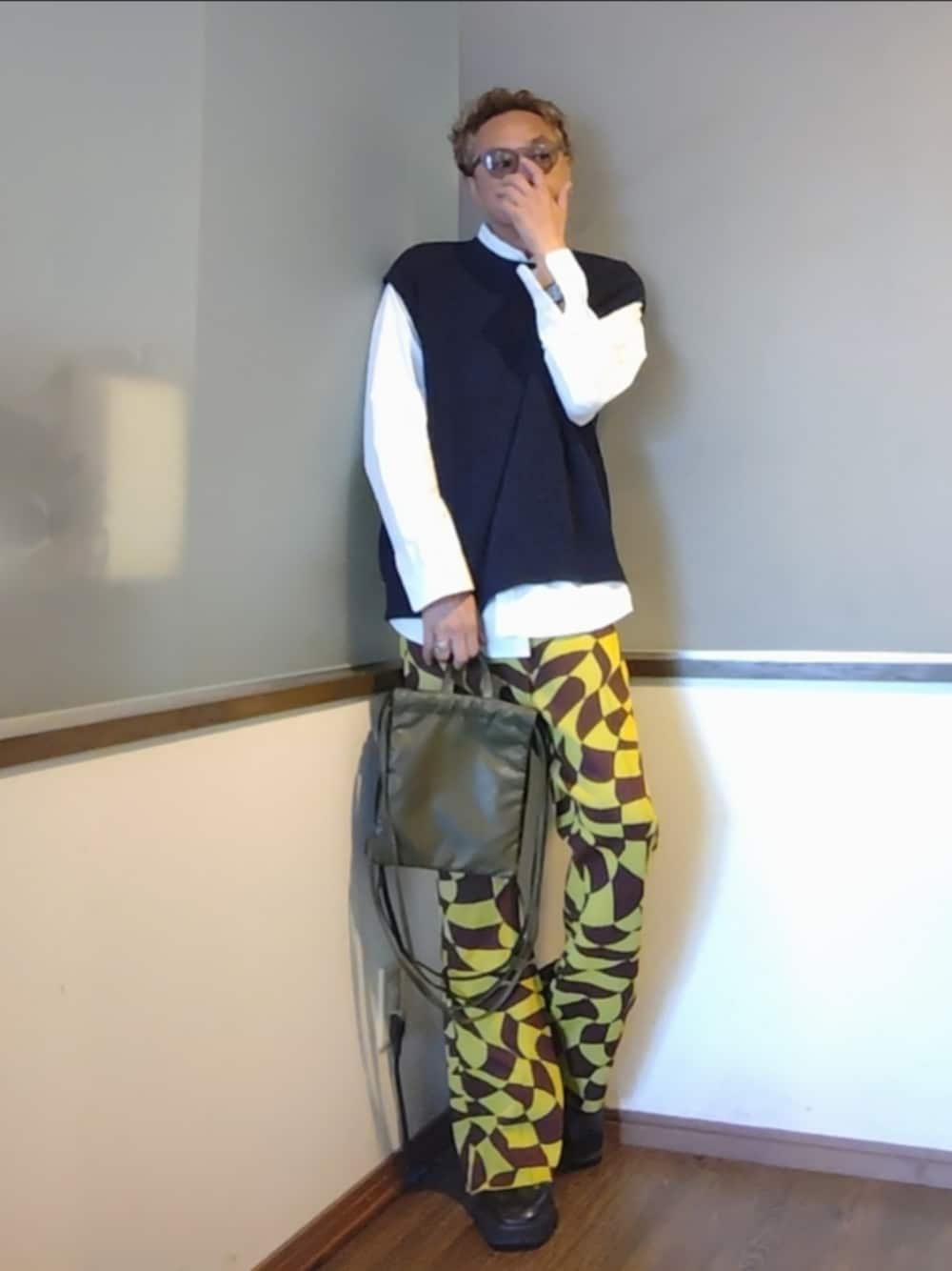 白シャツ×ニットベスト×ニットパンツの大人カジュアル。