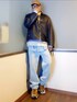 レザー✕ニット✕デニムの大人カジュアル。 暖かいけど風通しちゃうニットはレザーで風を防ぐのが◯ ハードになりがちな黒レザーもニットで印象変えてみる。