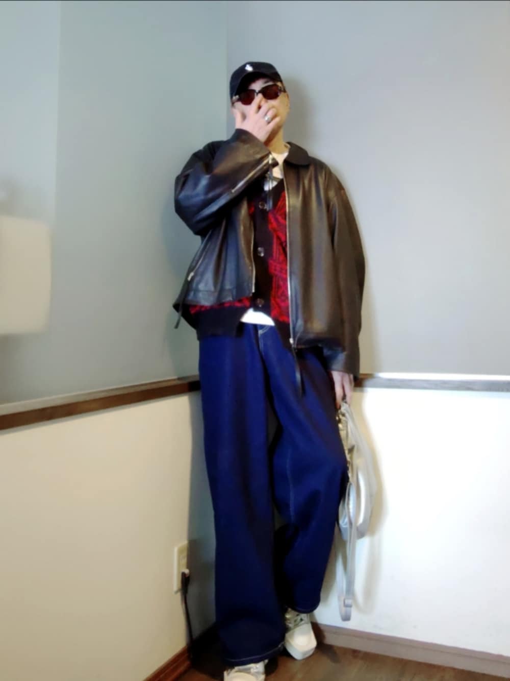 大人カジュアル。 レザー✕モヘアカーディガン✕アニメロンTに キャップとアイウェアとバッグを加えて。 個人的にシルバーのアクセントが◯