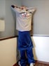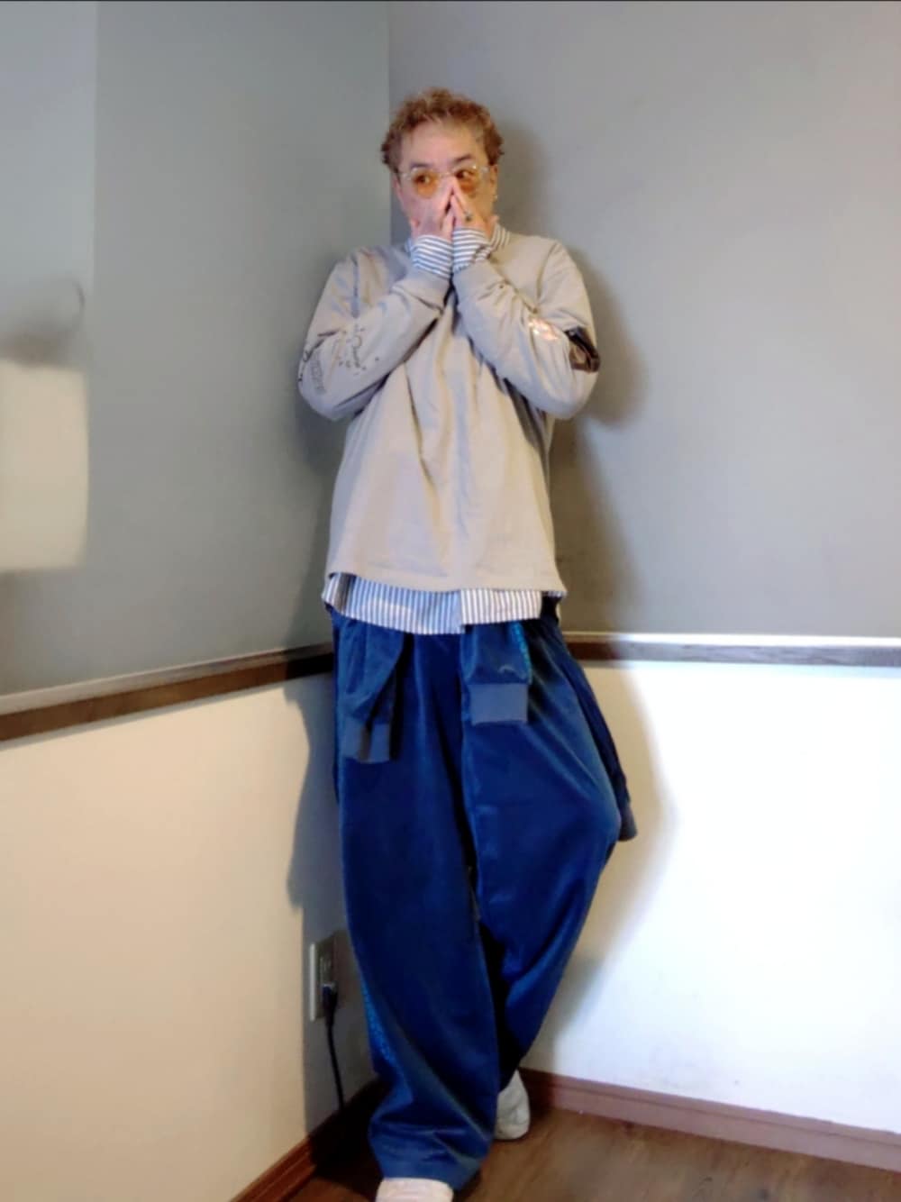 ベロアのセットアップ✕グラフィックロンT✕ストライプシャツ✕白スニーカーのスポーツミックスなレイヤードスタイル。 オーバーサイズのロンTとストライプシャツのレイヤードはサイズ感と素材がキモ。 中のストライプシャツもディフォルメしたみたいなデカさなので襟がよい感じ。 爪先くらいだと白スニーカーでも抜けすぎないのよね。
