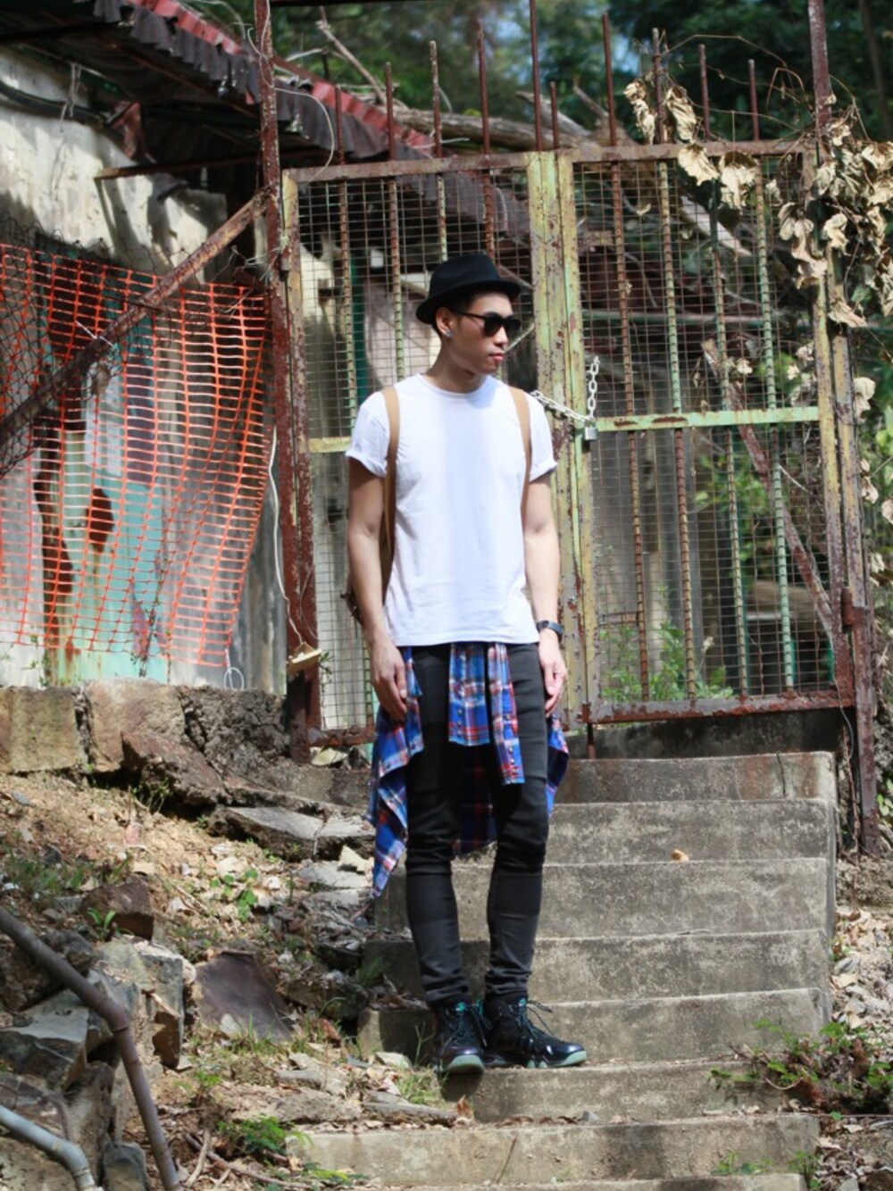 ホワイト系のTシャツ/カットソー、ブラック系のサングラスを着用したメンズの夏コーディネートの1枚目の写真