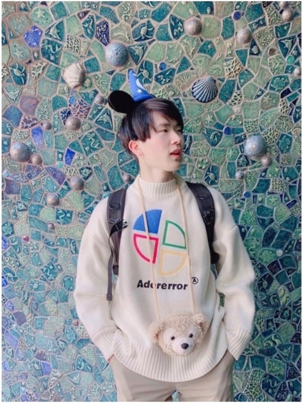 ディズニー楽しすぎて前髪ハゲた。 ディズニーなので少し派手なアーダーエラーのニットを着ました。 また、色に統一感を出すためにパンツはベージュにしました。