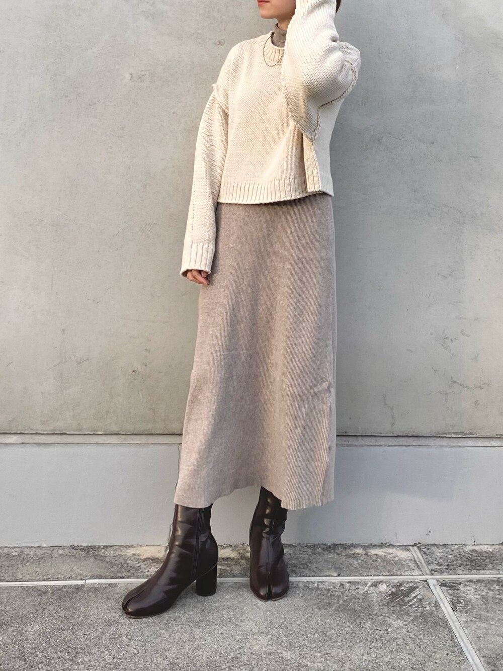 ニットのレイヤードコーデ トップスのニットのドロップショルダー具合が好きすぎる☺️ instagramもしてます✳︎ ↪︎@___man.maru