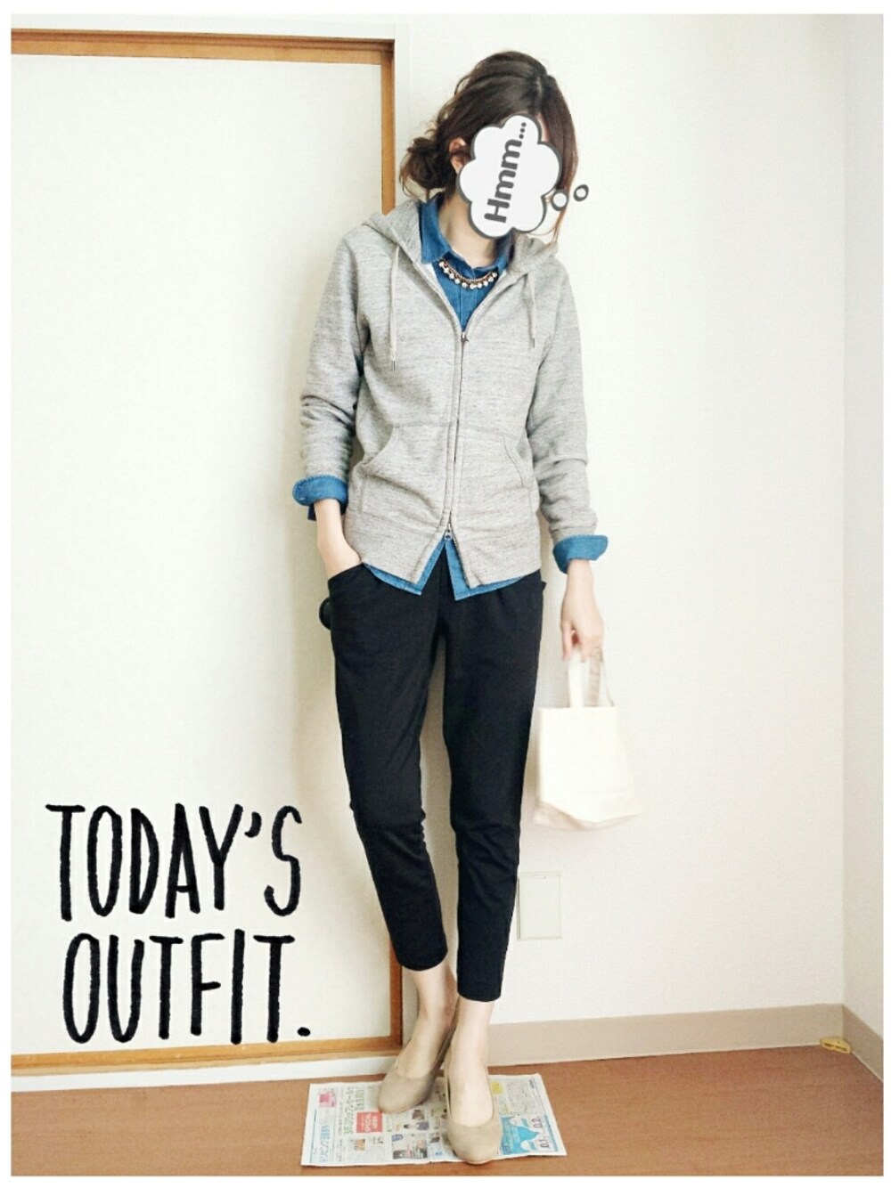 グレー系のパーカーを着用したレディースの春コーディネートの1枚目の写真