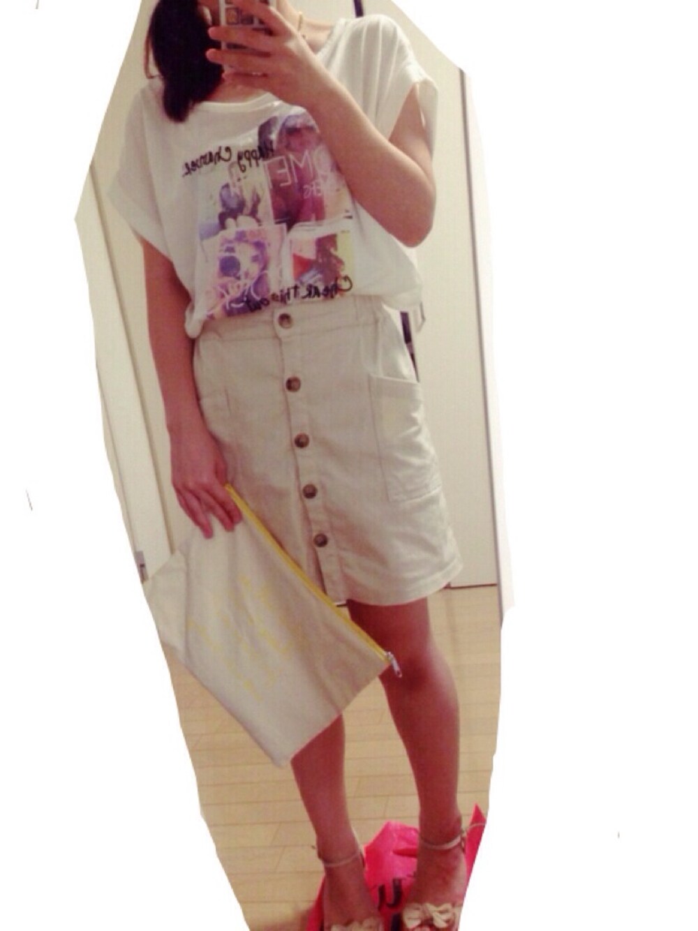 クラッチバッグはearthのノベルティ! 裏はイエローで、ペディキュアと傘もイエローでした♡偶然だけど…