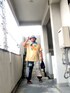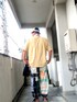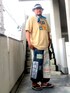 ポップなもんぺにねこタイツTシャツあわせて、買い出しスタイル