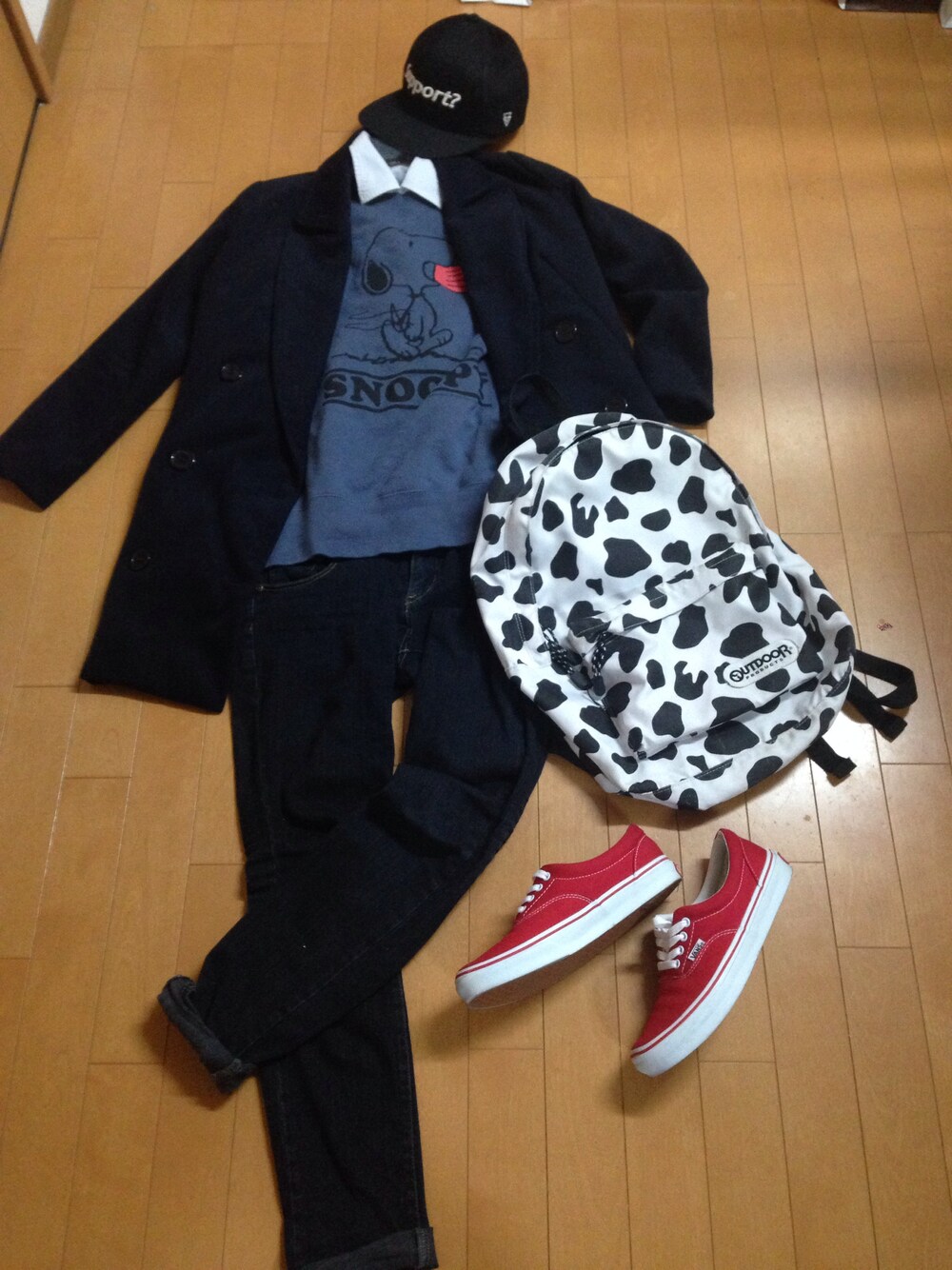 スヌーピーがお気に入り。スウェット×シャツの組み合わせが好きです。ロングコートをキャップ、リュック、スニーカーではずしてストリート風に。 小6から履いているスキニーに穴が開いたけど気にしません。