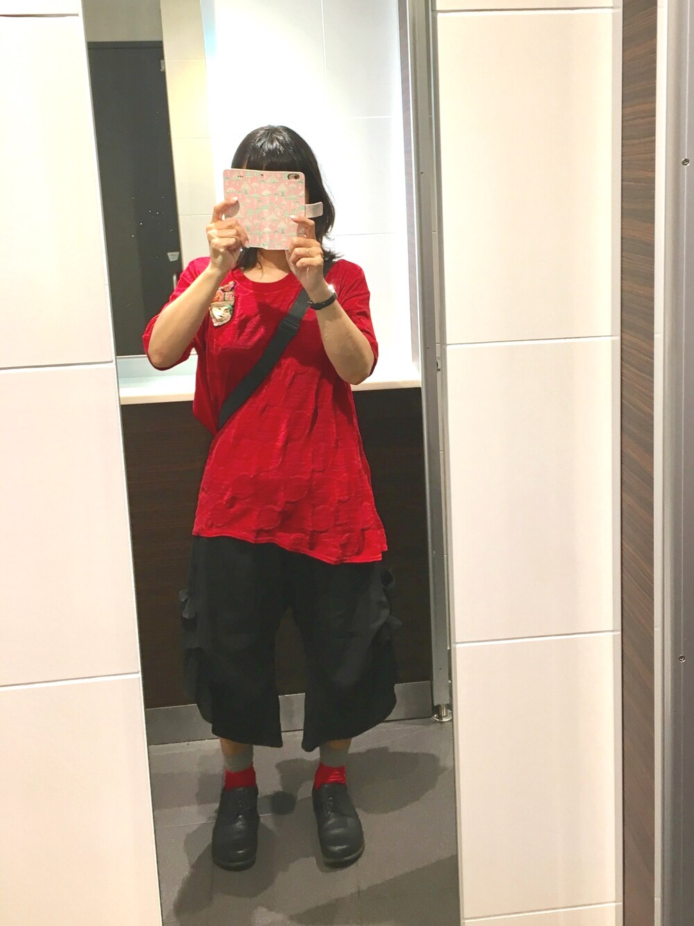 gommeでまとめてみました。 凸凹ドットがデザインされた赤の半袖トップスは、私にとっては今秋のチャレンジカラーです。後ろ身ごろがTシャツ風綿なので、着やすくてオススメです。サイドシャーリングPTも、ウエストゴムの上にシャーリングが足を細く見せてくれる感じがします。バッグは肩紐しか写っていませんが、ZUCCaのムック本付録の3WAY BOX BAGです。最近のヘビロテです。 殆ど見えませんが、知人の陶芸家の民族ブローチもアクセントです。