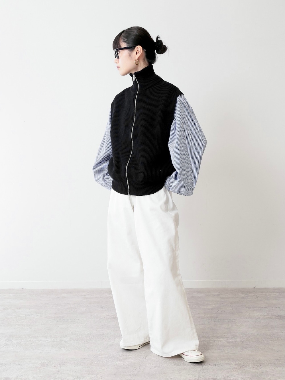 ニットベストを中心にメンズライクなスタイリング。 全体的にゆったりしたシルエットなので、髪をまとめたりメガネをかけることできちんと感も忘れずに。 ------------------------------------------ ニットベスト ▶︎FOLL サイズ / 2 サイズ感 / 身幅はゆったりめで、裾リブはタイトな作りです。肩はフレンチスリーブくらいの長さ。 素材感 / 春先に着やすいコットンニットです。 ------------------------------------------ シャツ ▶︎ FOLL サイズ / 3 サイズ感 / サンプルサイズのため一番大きいサイズ着用。メンズのXLくらいのオーバーサイズです。 素材感 / 柔らかく薄手の綿素材。襟にはワイヤーが通っていて形を調節しやすくなっています。 ------------------------------------------ パンツ ▶︎ FOLL サイズ / 3 サイズ感 / サンプルサイズのため一番大きいサイズ着用。サイズ3はメンズのLサイズくらいの着用感です。サイズ1だとレディースのS〜Mサイズくらいの方がジャストで穿けるサイズ感です。 素材感 / しっかり厚みのあるデニム素材ですが、着た感じは柔らかく動きやすい印象でした。