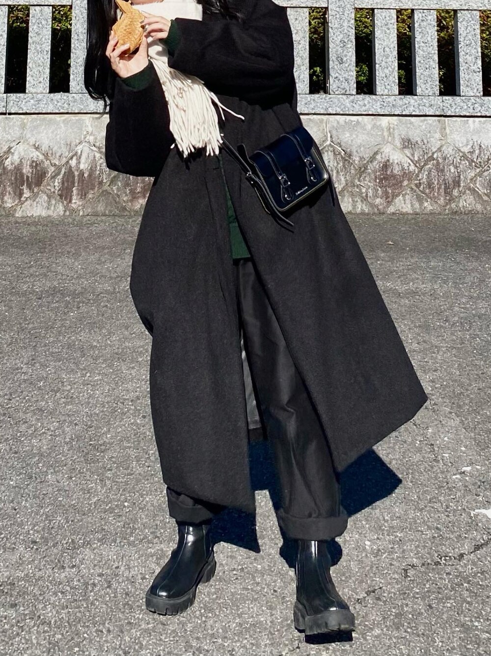 〔inner〕 UNIQLO-エクストラファインメリノリブタートルネックセーター(長袖),OFF WHITE,L 〔tops〕 UNIQLO-ライトウェイトローゲージ アランクルーセーター(長袖),DARK GREEN,L 〔outer〕 Ungrid-起毛ルーズチェスターコート,BLACK,small 〔bottoms〕 UNIQLO-コットンワイドパンツ,BLACK,64 〔shoes〕 Kastane-厚底ミドルブーツ,BLACK,39 〔muffler〕 sense of place-ニットフリンジストール,ivory 〔bag〕 Dr.Martens-7SATCHEL シザーショルダーバッグ,BLACK ・ ・ ズボンの裾を折ってブーツが見えてるのがスキ!