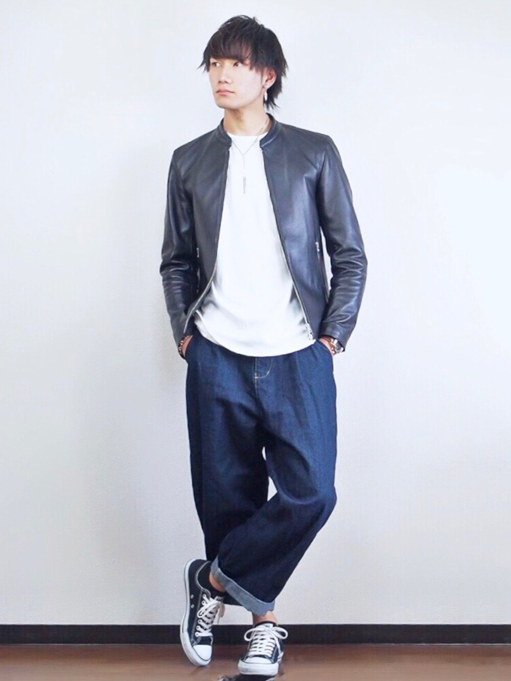 ご観覧ありがとうございます(^^) ライダースを使ったコーディネート♪ 白×黒×青 ワイドデニムを合わせてAシルエットコーデ♪ 少しでもいいと思ってくれたらいいね、お気に入り、フォローお願いします😁👋